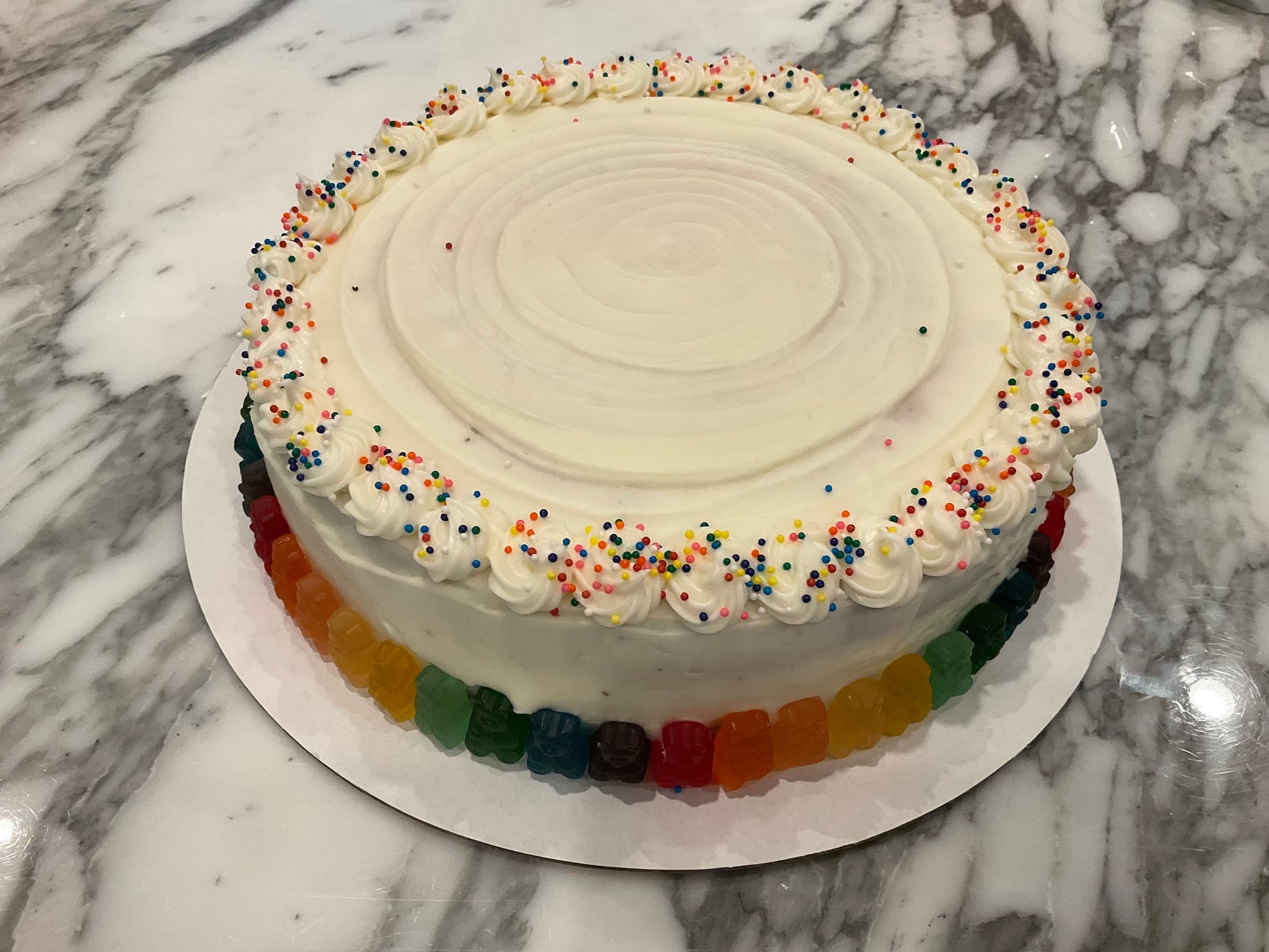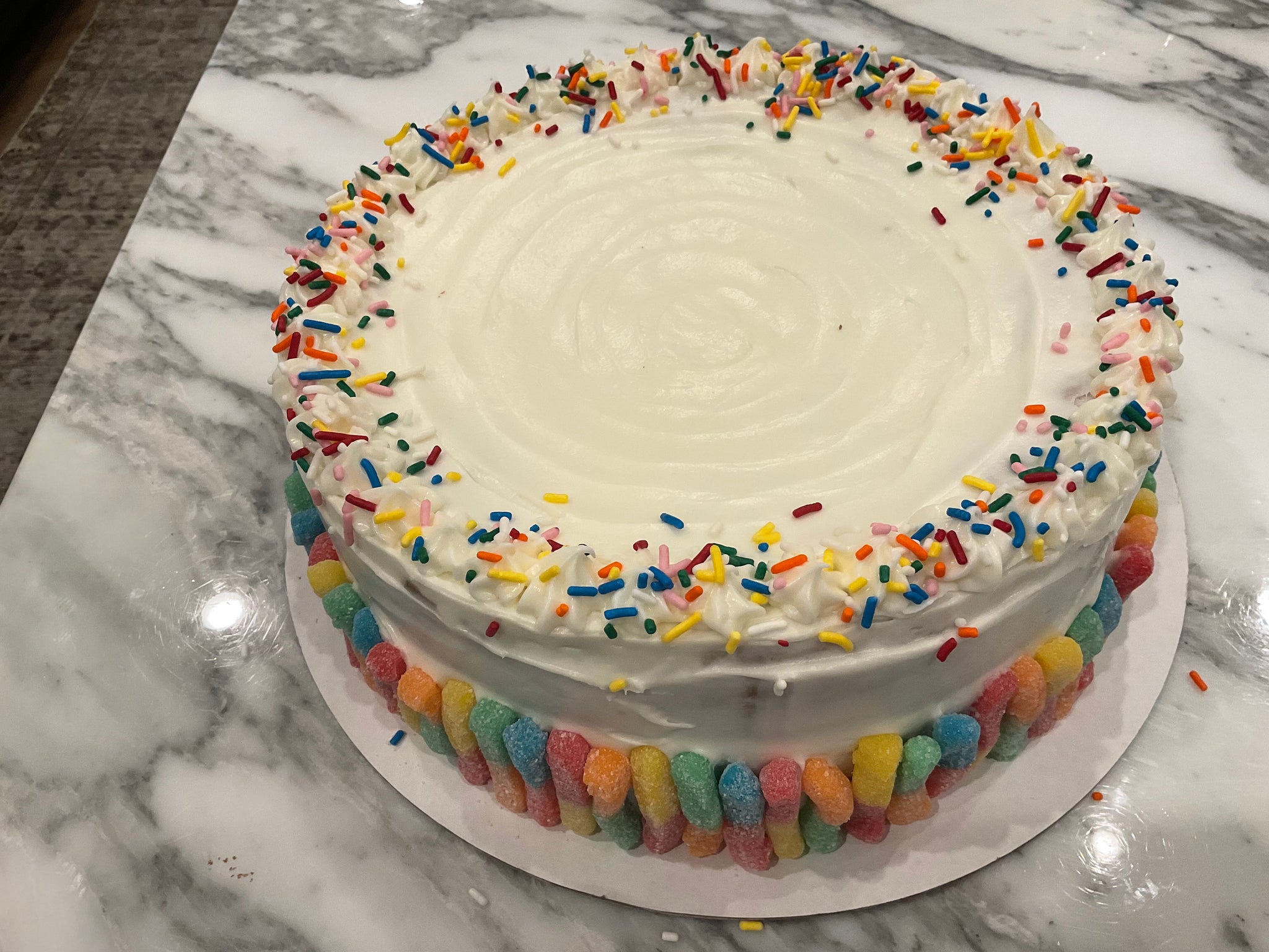 This cake is the perfect sweet surprise for any party or birthday! The cake is a soft moist vanilla sponge cake with light fluffy buttercream. On the outside, the cake is decorated wtih delicious chewy and fruity gummy bears and sprinkles.