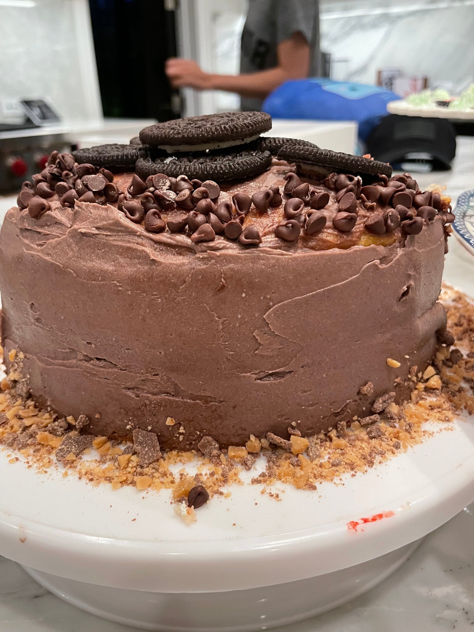 This cake has two layers with homemade chocolate frosting. It is covered with a Cadbury milk chocolate caramel square in the middle and Oreos. On the edge there are crushed up Heath bars. The best match for chocolate lovers.