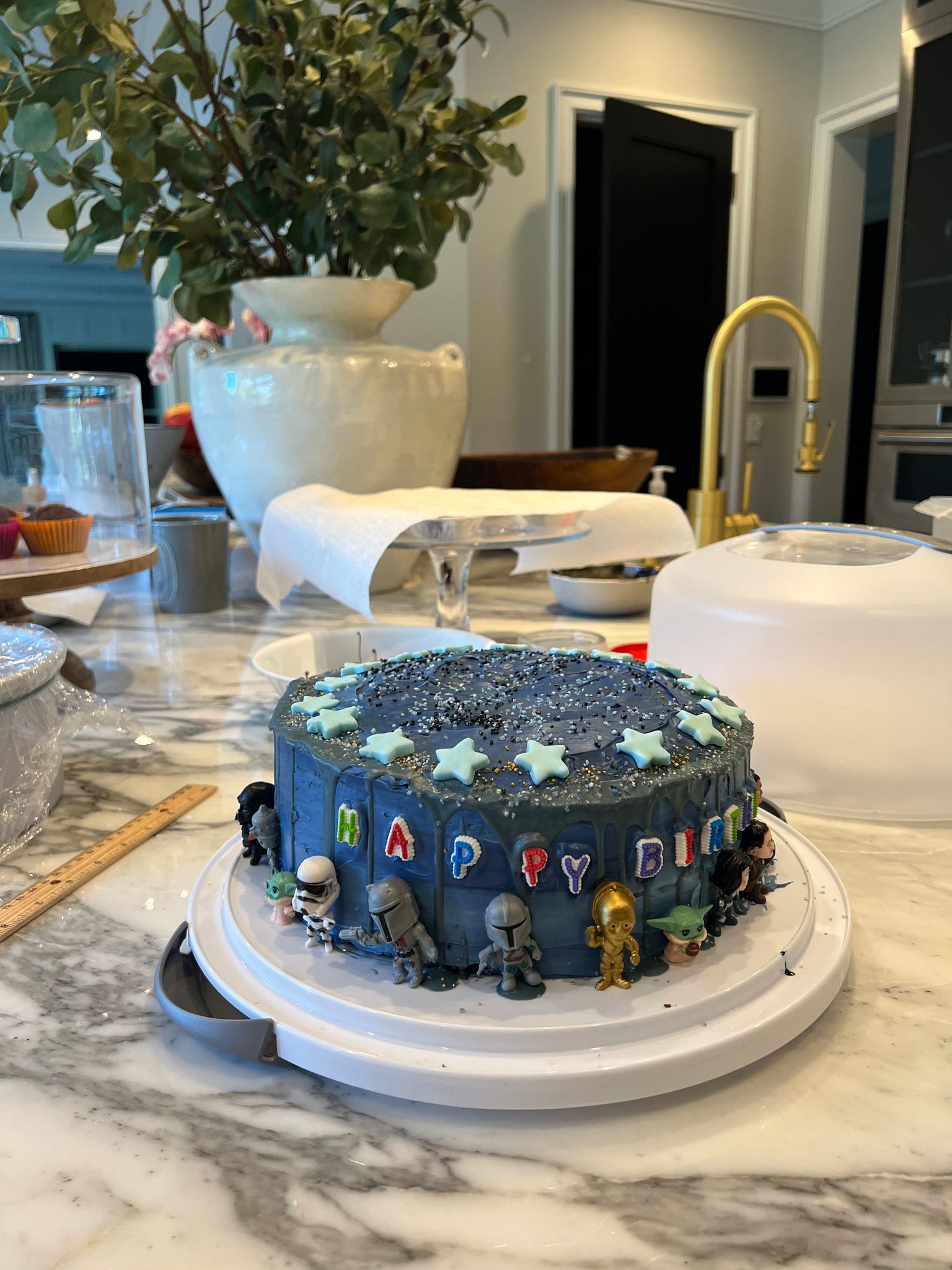 This product is a chocolate fudge cake. It has vanilla frosting mixed with blue and purple. It has multiple sprinkle types, light blue fondant stars, star wars dolls. This also has a big baby yoda on top.